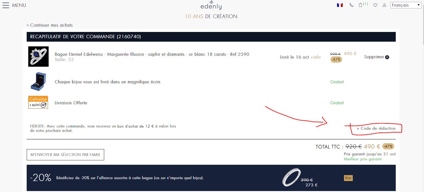 | Edenly | Bijoux en or et diamants haut de gamme (bague, bague de fiançailles, alliance de mariage, bracelet, collier, boucle d’oreilles, pendentif, médaille, symbole, chaîne). | Livraison gratuite Retour gratuit Remise à taille gratuite Gravure gratuite Écrin cadeau gratuit 2 ans de garantie Certificat d’authenticité | 20% de remise sur le deuxième bijou acheté | Edenly.com |