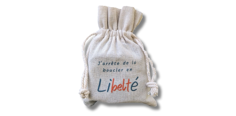 Nous avons reçu la ceinture Libelté 2 jours après avoir reçu la confirmation de la commande. La ceinture est livrée dans une enveloppe protégée par du papier bulle. Au sein de cette enveloppe, se trouve un petit sac en lin avec le logo Libelté et le slogan « J’arrête de la boucler en Libelté ».
