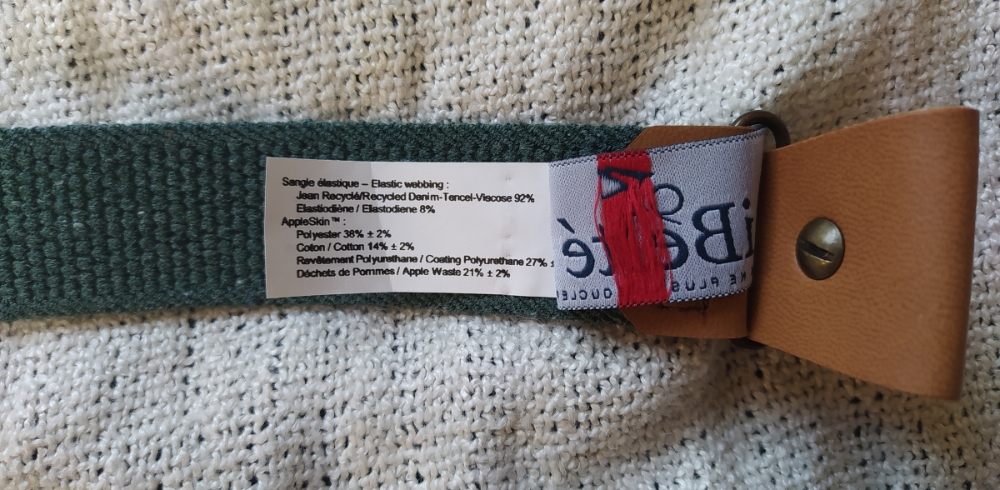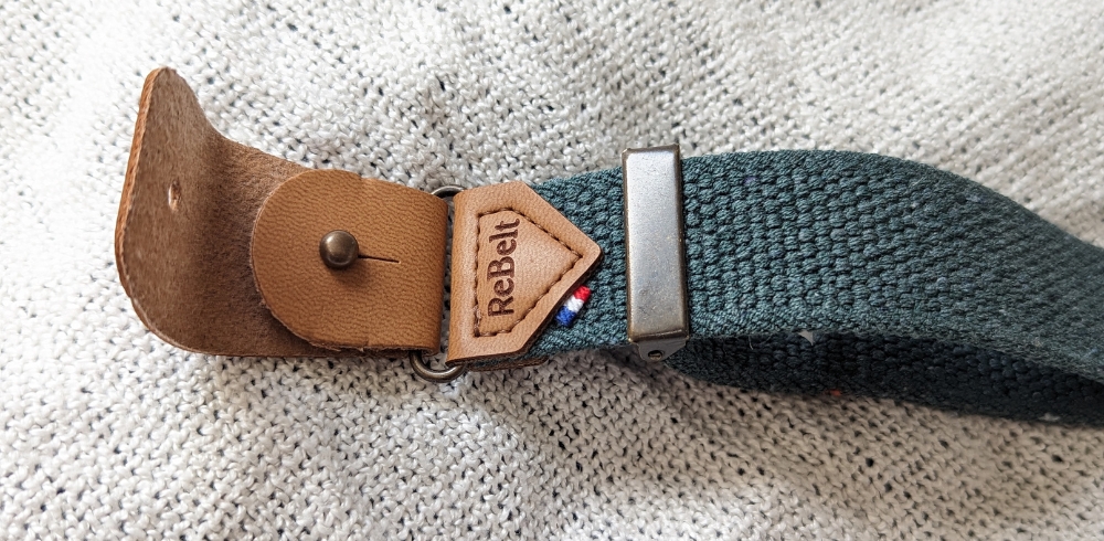 La ceinture sans boucle Libelté ( sa version ReBelt confectionnée à + de 90% de fibres recyclés à partir de vieux jeans norme GRS.