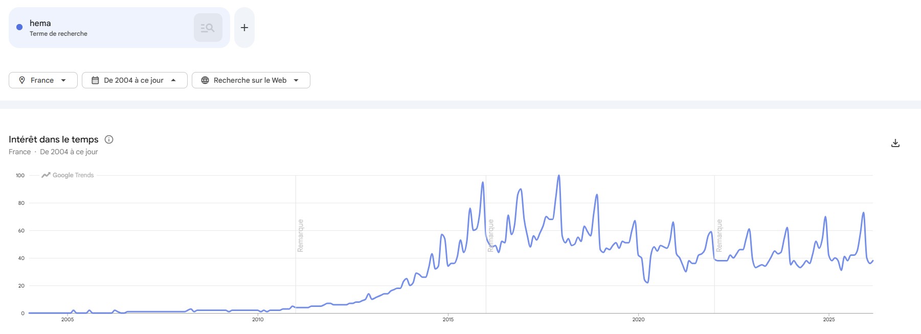 Aujourd’hui, l’attractivité de la marque semble stagner voire baisser depuis son pic entre 2015 et 2020, en témoigne les recherches sur le moteur de recherche Google (source : Google Trends).