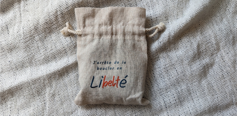Nous avons reçu la ceinture Libelté 2 jours après avoir reçu la confirmation de la commande. La ceinture est livrée dans une enveloppe protégée par du papier bulle. Au sein de cette enveloppe, se trouve un petit sac en lin avec le logo Libelté et le slogan « J’arrête de la boucler en Libelté ».