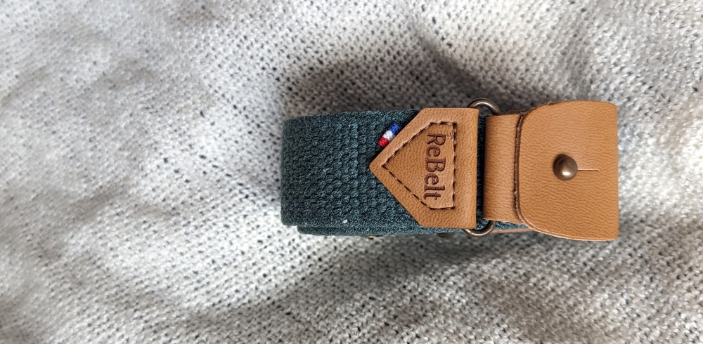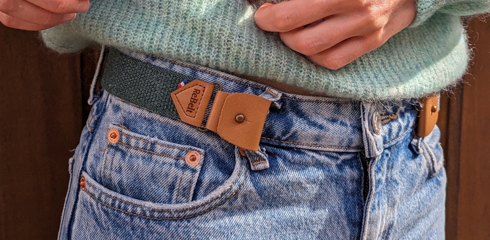 La ceinture sans boucle Libelté ( sa version ReBelt confectionnée à + de 90% de fibres recyclés à partir de vieux jeans norme GRS.